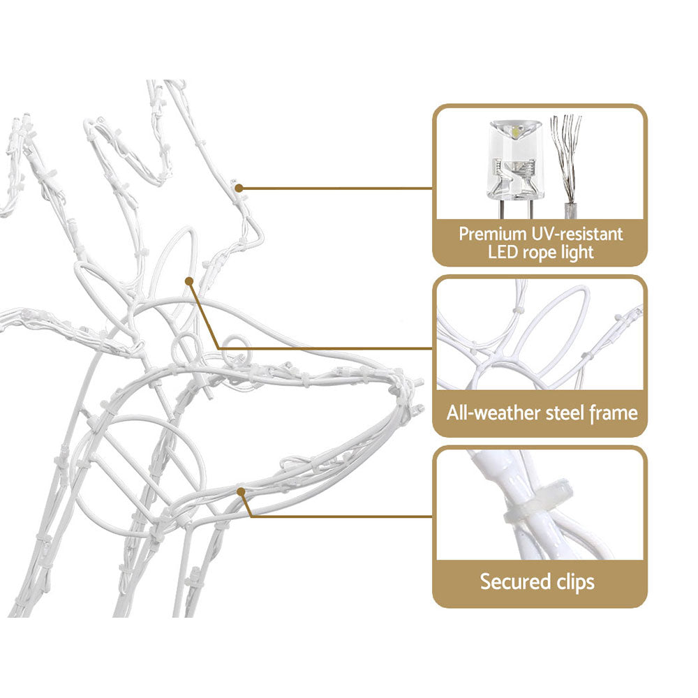 Bring the brilliance of Christmas to your home with our motorised Jingle Jollys 3PC LED Reindeer Light. The reindeer light comes in a family of three reindeers: a buck, a doe and a baby. The buck moves its head side to side, the doe moves its head up and down, while the baby remains still. Featuring a string of super bright LED lights, the UV-resistant rope light is set in a sturdy white metal frame shaped as a reindeer. The 10m long power cable gives you more flexibility on where you can set up the reindeer light. You can place it indoors in your living room, or outdoors on your front lawn for all your neighbours to appreciate. And you do not need to take the reindeer light down as soon as Christmas is over. It is waterproof and weather-resistant, so you can leave it out well into the new year. Create a lively and bright Christmas ambience throughout the season.