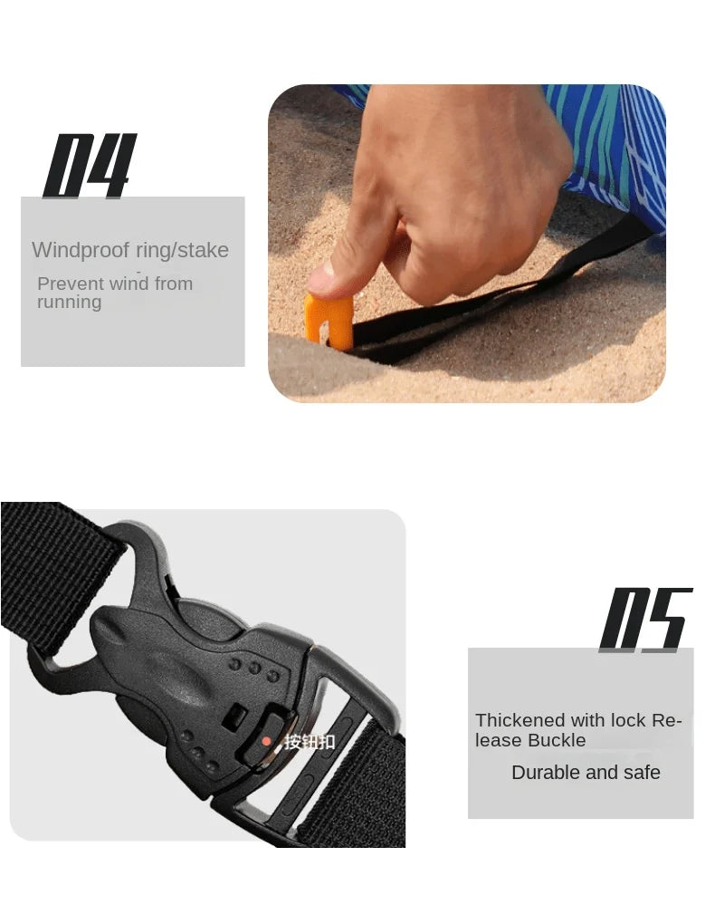 Lightweight inflatable beach bed sets up in minutes on sand. Quick-inflate air couch for seaside comfort without heavy furniture.