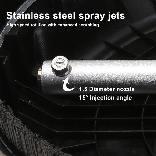 Designed for safety and efficiency, it features dual rotating nozzles made of stainless steel and brass to evenly clean horizontal and vertical surfaces. The durable ABS cover and built-in bristle ring help protect you from flying debris and splashback during use.